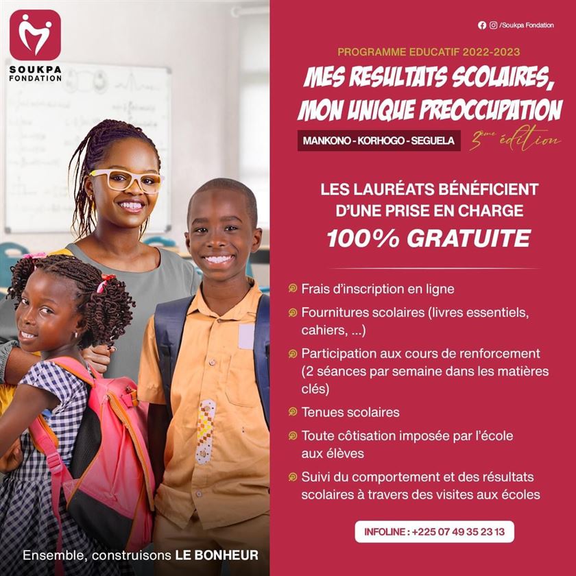 Ce programme consiste à une subvention scolaire complète d’enfants en classes de 4ème et CM1 et s’étendra sur 2 ans. Ils bénéficieront donc jusqu’à la fin de leur cycle actuel (CEPE et BEPC) d’un accompagnement 100% GRATUIT. Le programme éducatif a démarré avec deux éditions jumelées à savoir, l’année 2020-2021 et l’année 2021-2022.